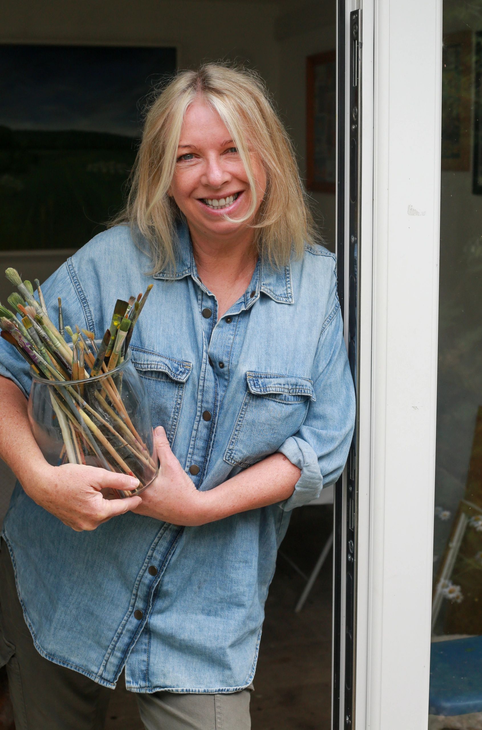 Sarah Thompson-Engels lives and works in Taunton, Somerset. She is best known for her irreverent and quirky mono-prints and colourful, graphic images. Equally popular are her large-scale flower and vegetable paintings inspired by her lovely garden.